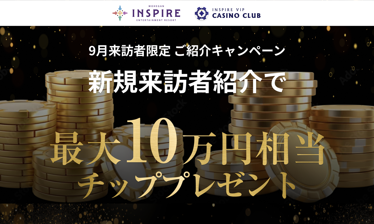 インスパイアカジノへの新規ご来訪者をご紹介いただいた方に、プロモーションチップをご提供いたします。プロモーションチップの金額は、新規ご来訪者のバイイン金額に応じて異なります。